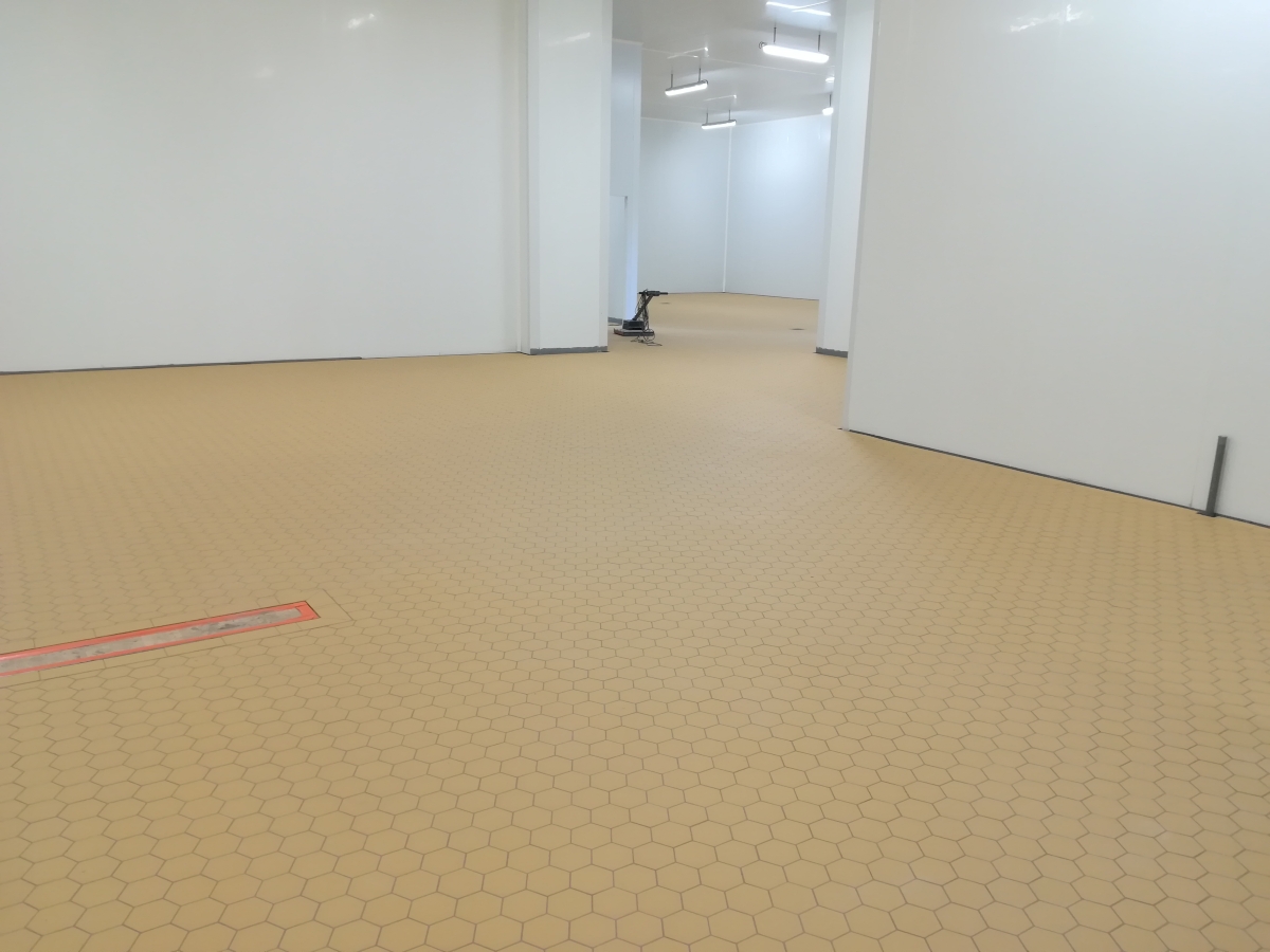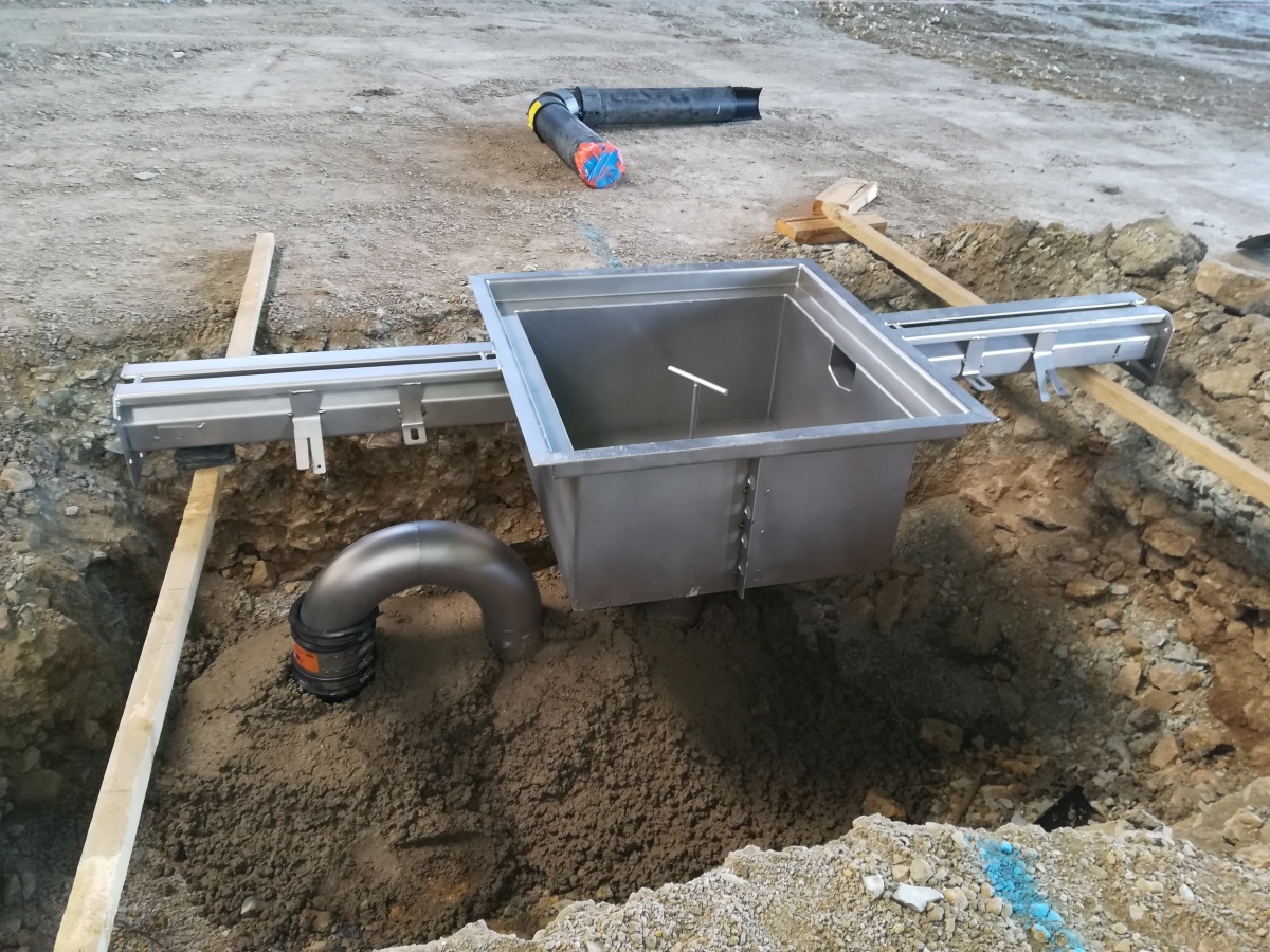 -> 80 siphons de sol inox posés, avec des pentes étudiées pour garantir l’hygiène et l’écoulement.